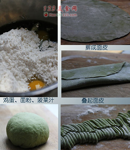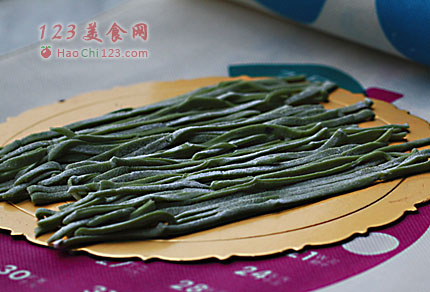 4、叠起面皮,切成面条。