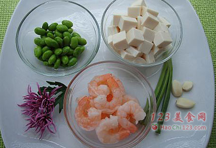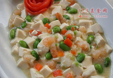 3、中火加入毛豆仁、虾仁粒翻炒1分钟,然后加入豆腐粒。