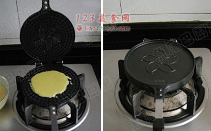10、倒入事先热一下的蛋卷模具中。