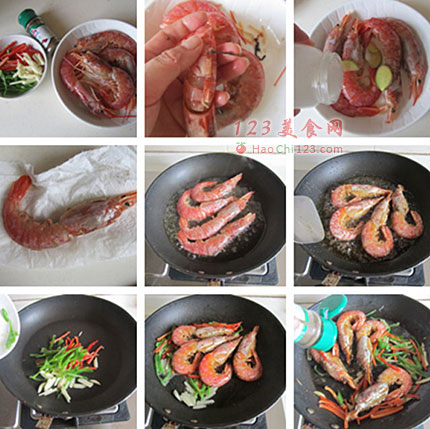 3、加入青红椒和蒜丝煸炒是为了让口味更复合,炒出香味后再下入炸好的红虾,边翻炒边加入椒盐,椒盐的量要大点,双面都要撒上,并要撒的均匀。[sushi.laoyanhuo.com]