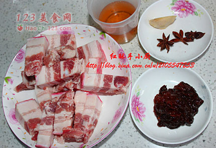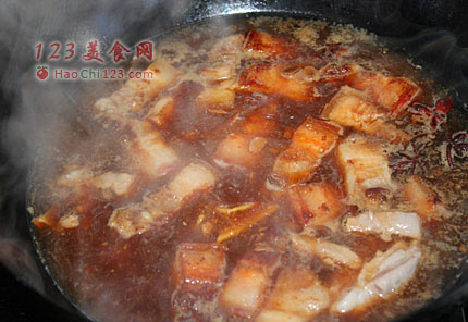 3、煎好的红烧肉倒入铁锅,加水没过肉,放入豆瓣酱,姜片,八角,盖锅,烧开后,转小火。