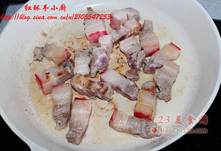 2、平底锅放少许油,将腌好的五花肉放入煎制至四面微黄。