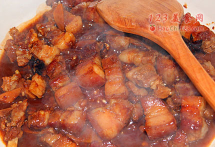4、汤汁收至快干的时候,转入之前的平底锅,放入几粒冰糖,调味,熬至汁干味浓,出锅。