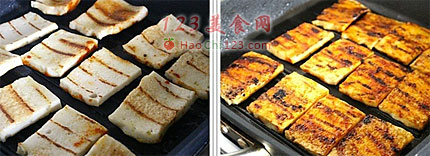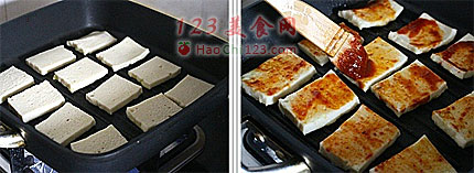 6、翻过面的千叶豆腐上也同样刷上韩式辣酱,煎烤2分钟后,再次翻面煎烤1-2分钟,待表面微微变焦即可出锅。