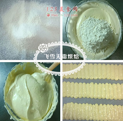 8、放入裱花袋中,在铺有油纸的烤盘中,挤成手指形状。