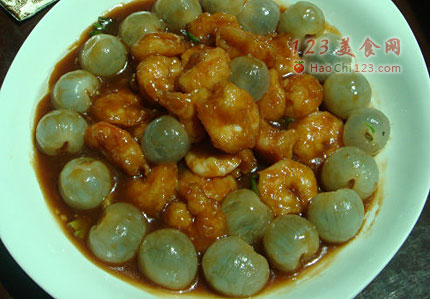 4、留少许底油爆香葱加入酱汁烧开、加龙眼、和炸好的虾仁炒拌均匀出锅即可。