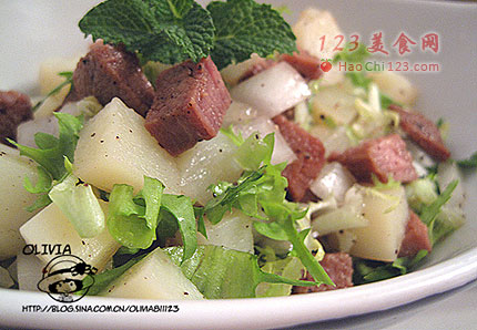 5、把准备好的土豆丁、苦菊、洋葱丁和牛肉粒装在一个碗中,放入适量橄榄油、盐、黑胡椒调味即可。