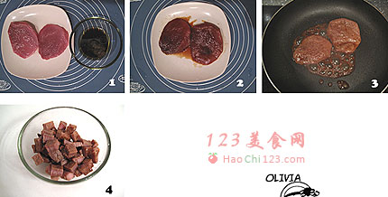 3、平底锅内倒入适量橄榄油,把腌制好的牛肉放入锅中,小火煎制,待熟后出锅即可。