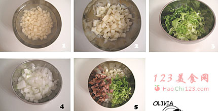 二、蔬菜的准备:1、土豆一个,洗净削皮,切成丁状,过两遍清水。