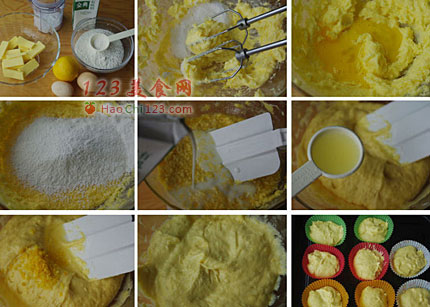 7、搅好的面糊分装进纸杯,装到约7分满即可,大号的纸杯我装了八个。