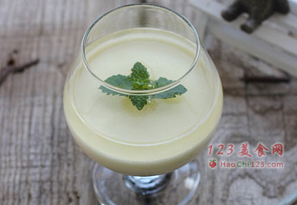 10、将一片薄荷叶插入杯中,做成盆栽的样子,然后倒入步骤9的吉利丁糖水溶液,放入冰箱冷冻室冷冻几分钟至吉利丁溶液凝固即可。