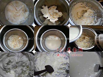 4、将吉利丁牛奶溶液分三次倒入搅打好的奶油奶酪中,每加一次搅打均匀再加下一次,最后打匀以后成奶酪糊。