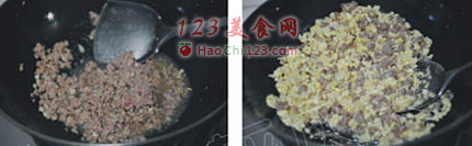 6、加入肉末炒至端生。