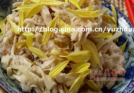 5、锅里放油烧热,放入姜丝爆出香味,下入鸡丝快速翻炒,当鸡丝快熟时放入菊花瓣,翻炒均匀。