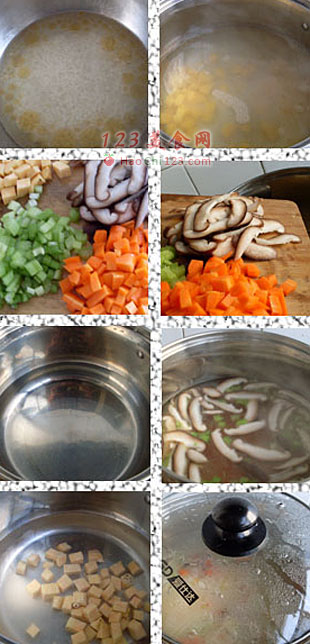 4、倒入准备好的所有蔬菜丁,等到水开以后开小火慢慢熬(在熬的过程中要不时的用勺子搅拌一下,防止糊锅)。