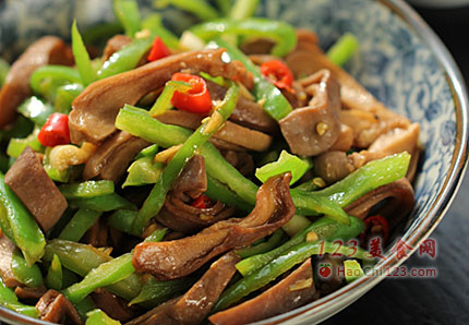 5、当然只喝汤未免太单调,取出半个煮熟的猪肚,用青椒一起炒,非常不错的搭配,炒出来的猪肚脆韧兼具、浓香爽口,酸辣开胃,下饭佐酒两皆宜。[sushi.laoyanhuo.com]