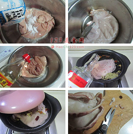 1、肚片清洗很重要,可以用盐或者食用碱里外不停的搓洗,每次都要用清水冲洗干净;最后一次用白醋清洗一遍;清洗好的猪肚要去除里面的油脂,再放入加了大料的水里煮上十分钟,拿出来再去除里面白色的膜;这样猪肚才算处理好了。