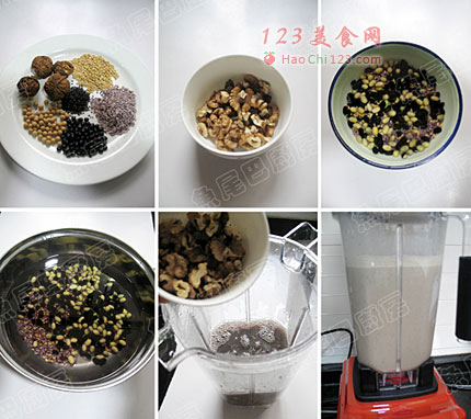 5、把煮好的豆类和汤汁、冰糖和烤香的芝麻、核桃一起倒入料理机或破壁中。
