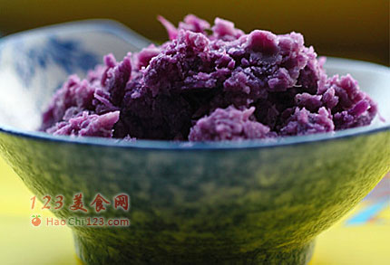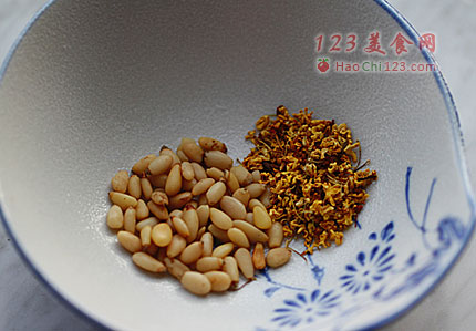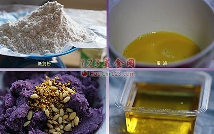 2、馅料:将紫薯煮熟去皮,在容器里塌碎,加入木糖醇糖浆一点、橄榄油半杯拌匀,再加入松仁和干桂花,拌匀。