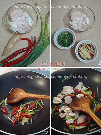 2、鱼泡洗净,沥干水份,葱洗净切成段,葱白葱叶分开,红椒洗净切斜段,姜去皮洗净切成丝待用。