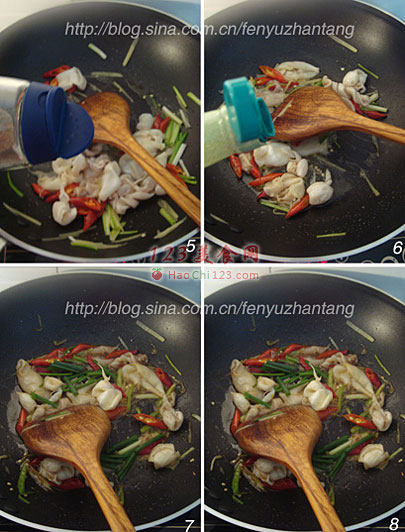7、8、继续翻炒至水分微干,然后撒入盐、鸡精和葱叶,翻炒至无水份即可。
