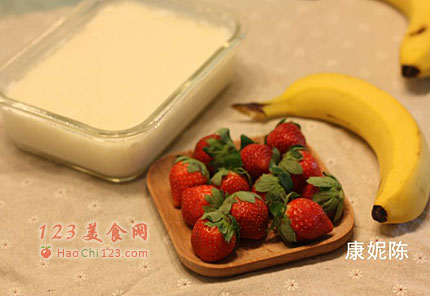 2、草莓切丁,把草莓丁、香蕉和酸奶一起放进东菱水果豆浆机里。