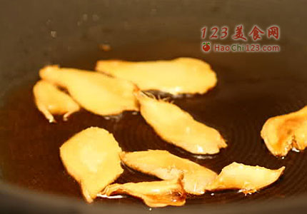 2、锅里放入适量黑芝麻油,放入姜片小火煎黄煎香。