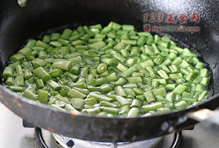 2、把四季豆出水后捞起备用(做四季豆有几点要注意的,要把豆边上的丝撕掉,不然口感不好,而且四季豆必须要彻底的煮熟,因为如果四季豆未煮熟,豆中的皂素会强烈刺激消化道,而且豆中含有凝血素,具有凝血作用。此外四季豆中还含有皂苷和胰蛋白酶抑制物,可刺激人体的肠胃,使人中毒,为了防止中毒的发生,食用前应该加以处理,可以用沸水焯熟,直到皮色变得润泽熟透即可)。
