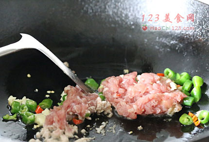 3、用锅爆蒜头和辣椒,加入霉香咸鱼肉沫爆炒。
