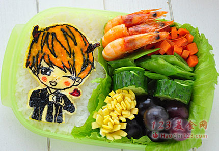 8、便当盒一半填上米饭,把人物放米饭上,果酱填色。
