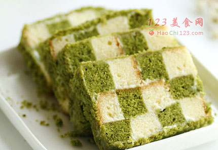 14、另取一片抹茶磅蛋糕,切成三小长条,分别贴在分割完成的蛋糕片边缘,颜色要错开。