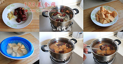 2、汤锅内放3大碗水,水开后放去姜丝和红枣熬煮(约5、6分钟即可)。