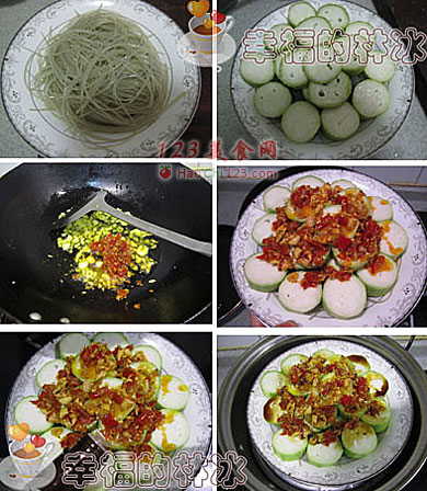 2、丝瓜去皮切成一厘米厚的块状放到粉条上。