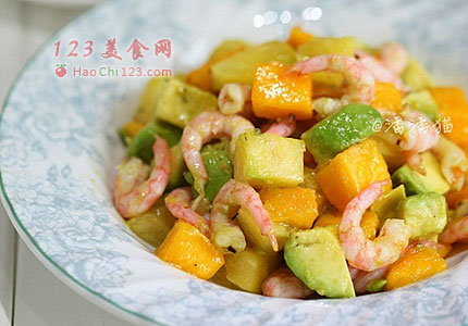5、将菠萝、牛油果、芒果、甜虾仁放入沙拉盆中,放入盐和黑胡椒碎。