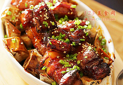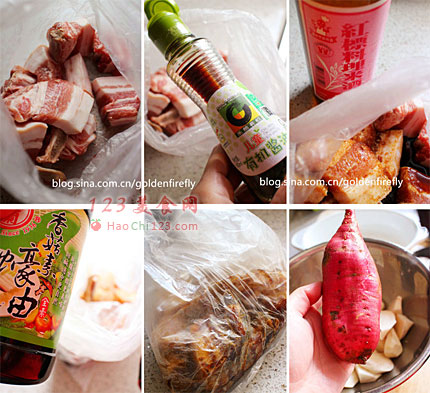 6、腌渍好的肉块依顺序排在甘薯块上层(剩余的腌肉酱料留着备用)。