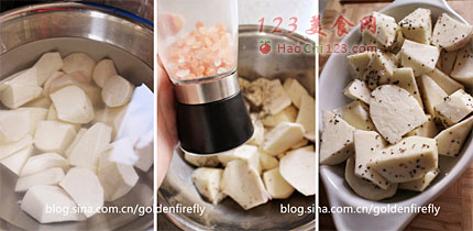 4、料理盆中入擦干的甘薯块,淋上橄榄油+黑胡椒粒+玫瑰盐,均匀沾附酱料。