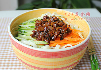 9、在面条上码上黄瓜丝和胡萝卜丝,浇上熬制好的炸酱即可。