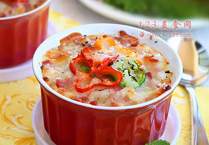 5、将处理好的土豆泥装在烤箱专用容器里,铺上一层马苏里拉奶酪(Mozzarella),然后再铺上一层培根条,撒上少许香草碎、黑胡椒碎、甜椒圈,入烤箱摄氏200度(华氏392度),烤12分钟左右,表面奶酪融化微黄即可。