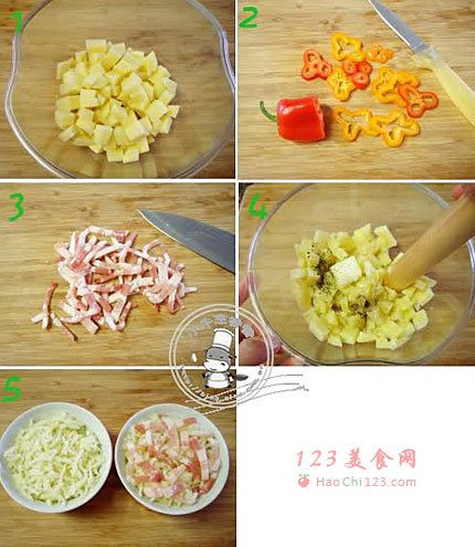 2、培根有咸味,所以加入土豆泥里的盐用量要掌握好,可以先尝一尝,以免过咸。