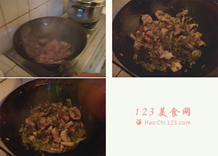 2、等乌鱼变色后,放入咸菜一同翻炒。