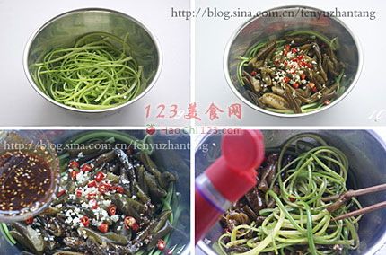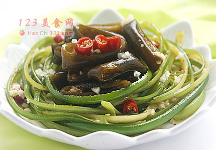 6、这道凉菜非常好吃,金茸片口感爽脆,蒜苔经过热水的氽制,少了生蒜苔独有的辛辣味,却依然保持着脆爽的口感。没有经过切割的痕迹,用原始手撕的方法,最大限度的保留了蒜苔的原味和功效。再加上香辣酸甜的酱汁,打造出一道惹人垂涎的健康凉菜。[sushi.laoyanhuo.com]