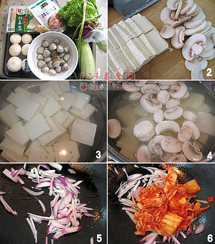 4、豆腐煮5.6分钟后加入口蘑继续炖煮。