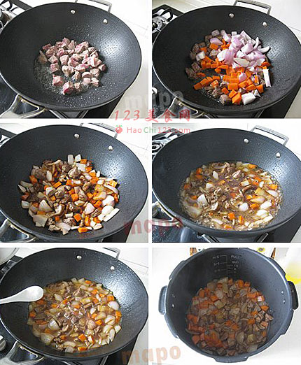 10、烧几分钟食材转入电饭锅,先不放汤。
