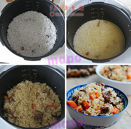 12、倒入炒锅内剩余汤注意汤水多少,与蒸米饭用水一致。