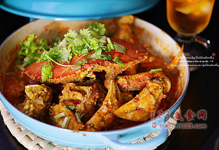 9、开盖后翻动蟹段,大火收干酱汁至浓稠即可关火,撒上香菜葱珠即可食用。