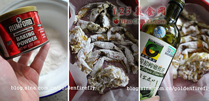 3、将材料B的粉类混合均匀,用刀背略將蟹殼敲裂,再将螃蟹所有的脚和蟹身都均匀沾上裹粉。