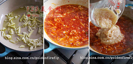 7、材料C的韩式酱料入锅中,小火煮至锅边起小泡,后再放入材料D的果泥续煮至小滚。
