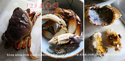 2、剔除蟹鰓,取下所有的螃蟹脚,再将蟹壳与蟹身分离,蟹身斩成对半。