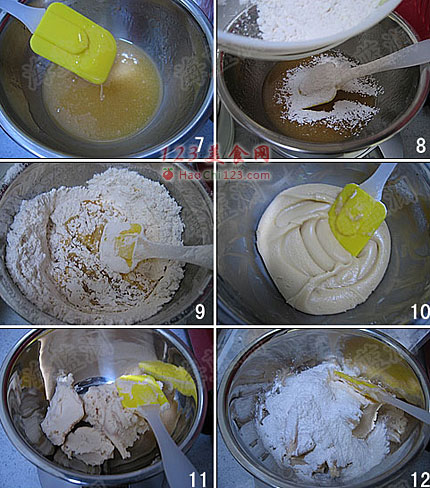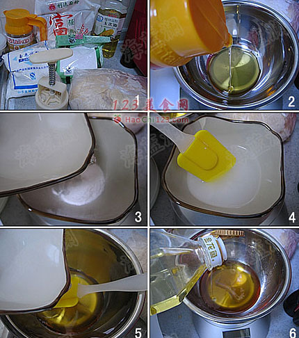 6、分次加入色拉油。每一次都调匀后再加下一次,一共30克油。