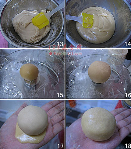 10、搅匀后的样子,即成月饼皮。盖保鲜膜放冰箱冷藏1小时。